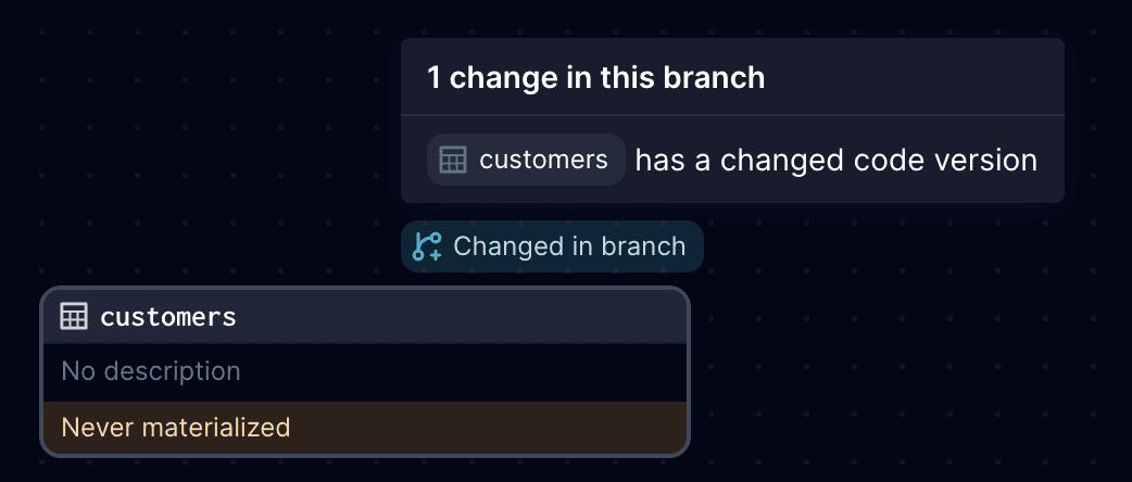 In this example, the customers asset has a Changed in branch label indicating its code_version has been changed.