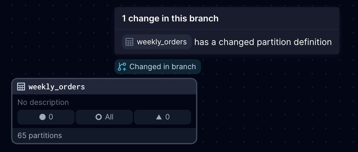 In this example, the weekly_orders asset has a Changed in branch label indicating a changed partitions definition.
